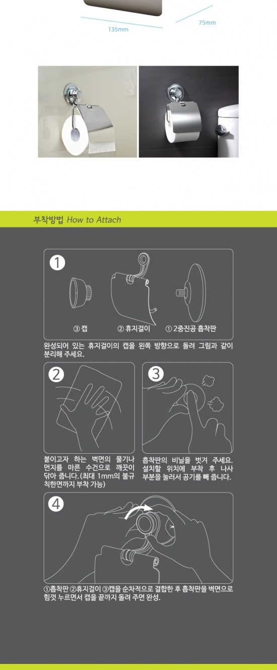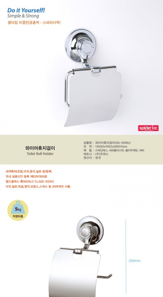 품 명 : 스파이더락 와이어 휴지걸이코 드 : T39-007재 질 : 스테인레스, ABS, 폴리우레탄, NBR고무구성품 : 휴지걸이 + 진공흡착판특 징 : 세계최초의 이중진공흡착판을 사용해 휴지걸이를 벽면에 매우 안정적으로 고정할 수 있습니다.